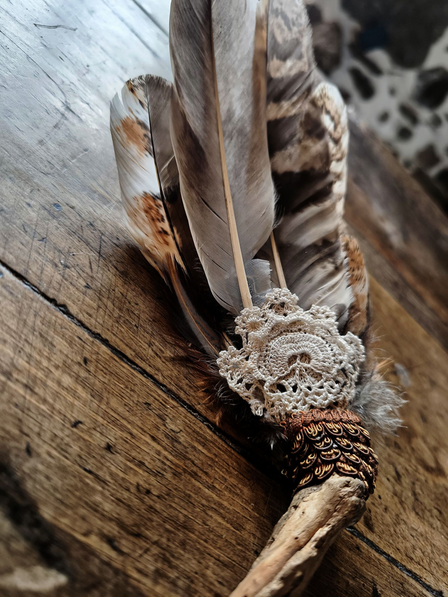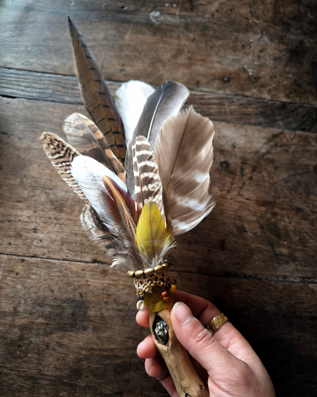 Objet sacré, il permet de diffuser la fumée d’encens, de sauge ou de résines lors des cérémonies, ou simplement d’orner un espace spirituel. Une pièce à la fois utile et décorative, reflet d’un savoir-faire artisanal inspiré par les traditions. L’usage d’éventails de plumes est notamment présent dans certaines pratiques amérindiennes, où ils servent à guider la fumée des plantes sacrées et à purifier l’espace.