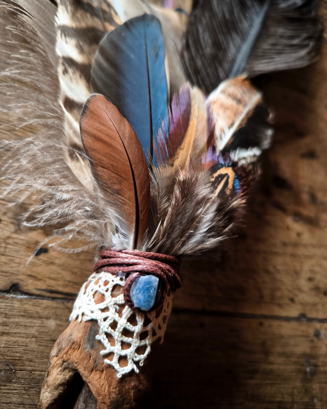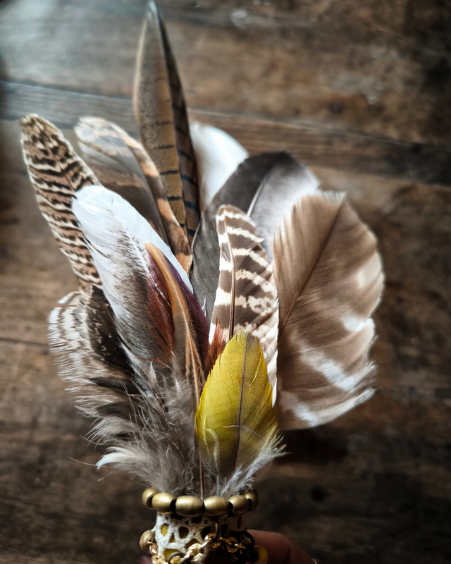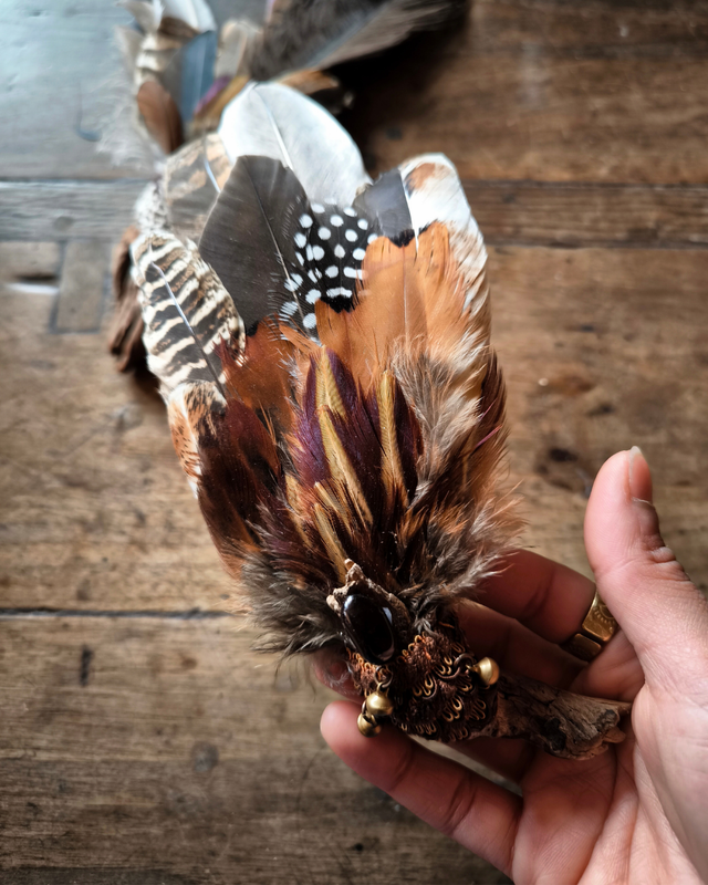 Éventail artisanal façonné à la main pour accompagner vos rituels de purification et de fumigation. Chaque pièce est unique et associe un ensemble de plumes naturelles (faisan, autruche, pintade, perruche, pigeon…) à une pierre semi-précieuse choisie pour son énergie (ici grenat, saphir ou pyrite).